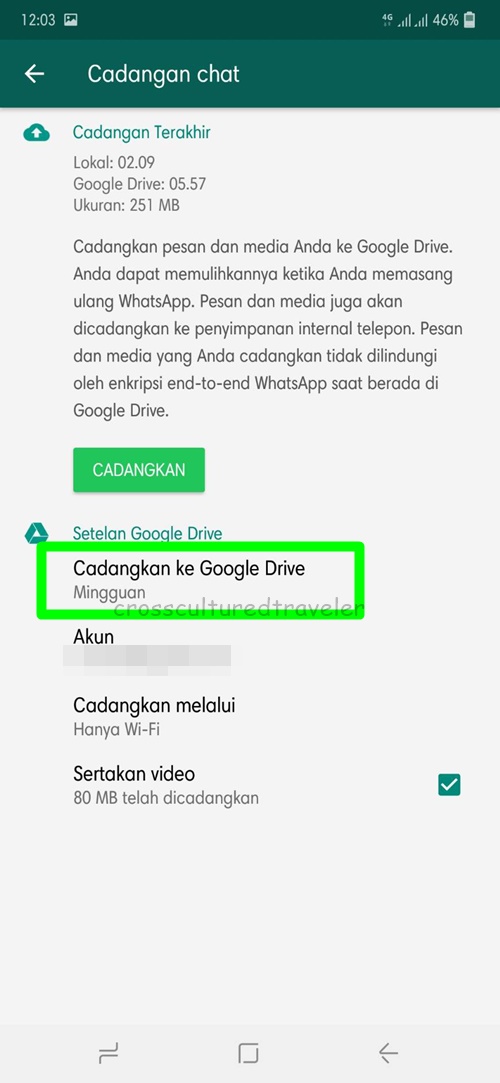 • Selanjutnya pilih cadangkan ke Google Drive, disitu akan muncul beberapa pilihan. Pilih sesuai yang kalian inginkan.