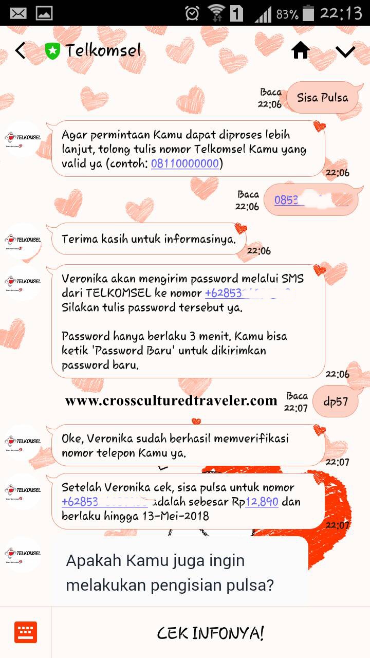 - Setelah pesan kita dibalas lagi, masukkan nomor telepon anda. Dan kemudian, anda akan mendapatkan kode verifikasi (OTP) dari telkomsel, masukkan kode tersebut lalu kirimkan kembali. Yeaayyys, asisten virtual akan mengirimkan informasi pulsa dan masa aktif nomor anda.